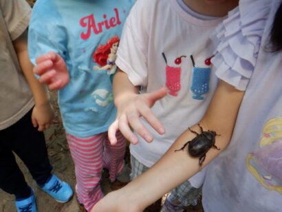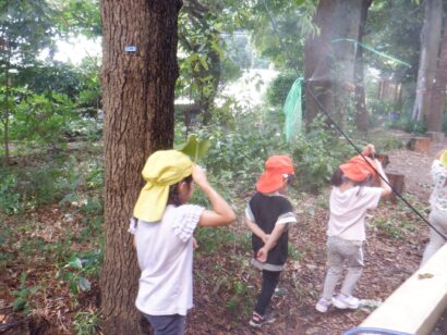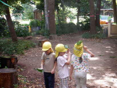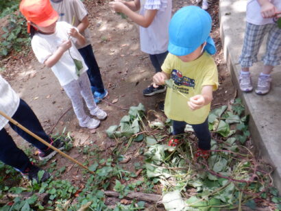 毎日暑い日🌞が続いていますが、木陰で元気に遊ぶ子ども達です。畑のサツマイモの様子を見に行った際、お土産にサツマイモのつるをとってきた日のことです。「何これ?」「さつまいのつるだよ」とみんな集まってきました。はっぱをちぎったり、傘のようにしてミストの下をへ行ったりと思い思いに楽しみました。