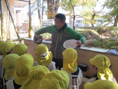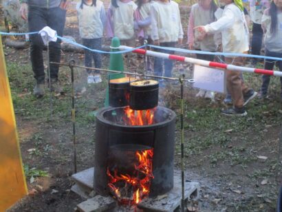 今日は、春から年長さんが育てたお米を飯盒炊飯で炊いて食べる日です。