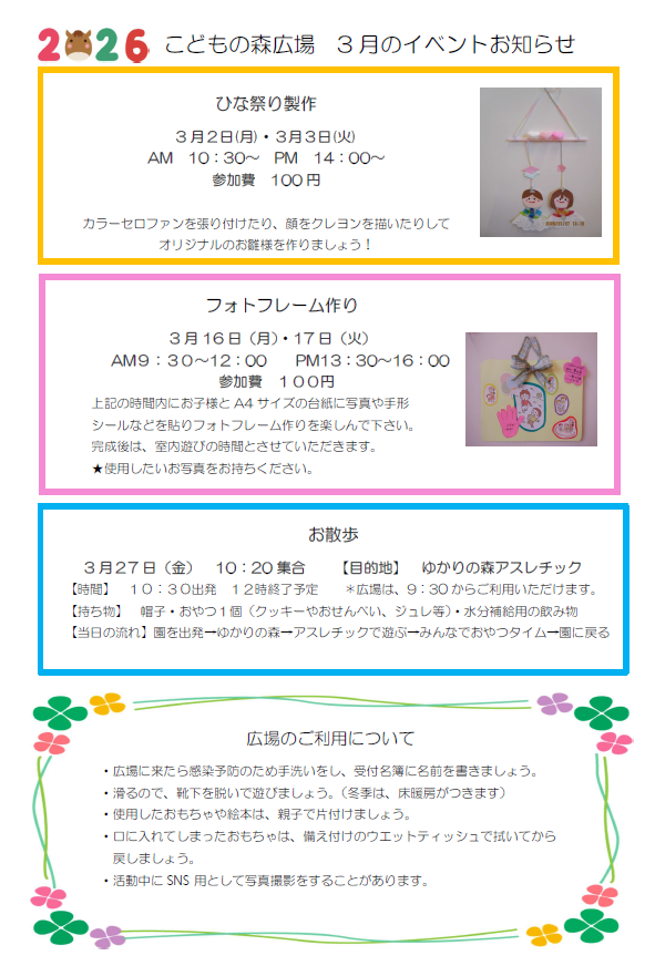 | ご利用方法 | 利用申し込みされる方は、初回のみ予約フォームの〔新規〕欄にチェックを入れて下さい。 初回来園時に登録手続き(無料)をします。 |