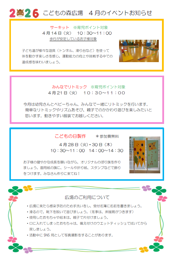 | 対象者 | 0歳児から未就学児の親子。※利用規定を守って頂ける方。 |